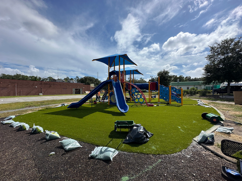 We installed our patented PlaygroundGrass Ultra for a playground at the elementary school. This variety is unique in that it is engineered for playgrounds – the only one of its kind in the market – specifically with its triple-layer backing, blade construction, antimicrobial and antistatic properties. The triple-layer backing adds cushion and stability, the blade construction withstands high foot traffic while delivering comfort, the antimicrobial addition helps to create a clean playing surface, and the antistatic properties ensure that the turf does not create static interference for children with health devices (hearing aids, heart monitors, etc.).